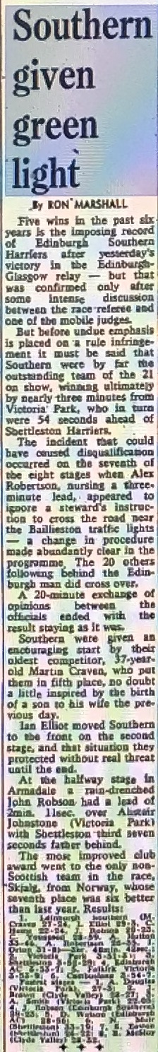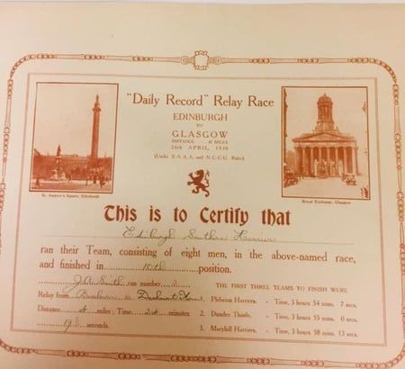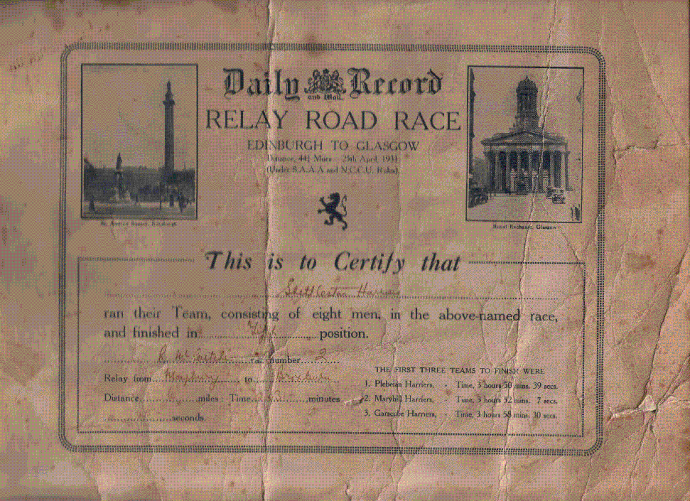 The Edinburgh to Glasgow Road relay was first run on the 26th April 1930. The race immediately became the premier club road race of the year consisting of 8 stages from Edinburgh to Glasgow following mainly the A8. It was last run on the 24th November 2002. After that a decision was taken to stop the race due to increasing traffic problems.